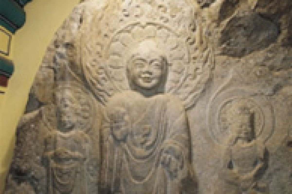 충청남도 서산시 운산면 가야산 계곡을 따라 들어가면 층암절벽에 거대한 여래입상을 중심으로 오른쪽에는 보살입상, 왼쪽에는 반가사유상이 조각되어 있다. 흔히 ‘백제의 미소’로 널리 알려진 이 마애불은 암벽을 조금 파고 들어가 불상을 조각하고 그 앞쪽에 나무로 집을 달아 만든 마애석굴 형식의 대표적인 예로 꼽힌다. 연꽃잎을 새긴 대좌(臺座) 위에 서 있는 여래입상은 살이 많이 오른 얼굴에 반원형의 눈썹, 살구씨 모양의 눈, 얕고 넓은 코, 미소를 띤 입 등을 표현하였는데, 전체 얼굴 윤곽이 둥글고 풍만하여 백제 불상 특유의 자비로운 인상을 보여준다. 옷은 두꺼워 몸의 윤곽이 드러나지 않으며, 앞면에 U자형 주름이 반복되어 있다. 둥근 머리광배 중심에는 연꽃을 새기고, 그 둘레에는 불꽃무늬를 새겼다. 머리에 관(冠)을 쓰고 있는 오른쪽의 보살입상은 얼굴에 본존과 같이 살이 올라 있는데, 눈과 입을 통하여 만면에 미소를 풍기고 있다. 천의를 걸치지 않은 상체는 목걸이만 장식하고 있고, 하체의 치마는 발등까지 길게 늘어져 있다. 왼쪽의 반가상 역시 만면에 미소를 띤 둥글고 살찐 얼굴이다. 두 팔은 크게 손상을 입었으나 왼쪽 다리 위에 오른쪽 다리를 올리고, 왼손으로 발목을 잡고 있는 모습, 오른쪽 손가락으로 턱을 받치고 있는 모습에서 세련된 조각 솜씨를 볼 수 있다. 반가상이 조각된 이례적인 이 삼존상은『법화경』에 나오는 석가와 미륵, 제화갈라보살을 표현한 것으로 추정된다. 본존불의 묵직하면서 당당한 체구와 둥근 맛이 감도는 윤곽선, 보살상의 세련된 조형 감각, 그리고 공통적으로 나타나 있는 쾌활한 인상 등에서 6세기 말이나 7세기 초에 만든 것으로 보인다. 특히 이 곳은 백제 때 중국으로 통하는 교통로의 중심지인 태안반도에서 부여로 가는 길목에 해당하므로, 이 마애여래삼존상은 당시의 활발했던 중국과의 문화교류 분위기를 엿볼 수 있게 하는 작품이라 하겠다.